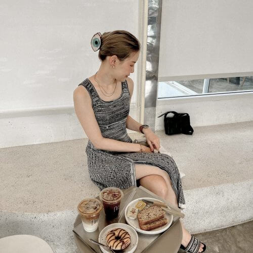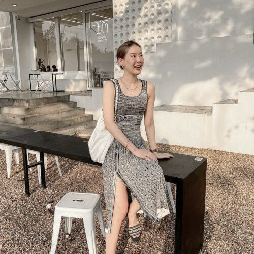เดรสยาวทอผสมสีผ้า Mixxi ยืดหยุ่นได้เยอะ ไม่บาง กระดุมที่ชายเสื้อและชายกระโปรงสามารถถอดได้