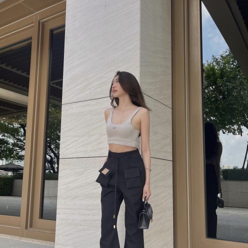 Description : Long trousers with high waist, lace-up detailing at the waist, with front pockets, hidden zippers, easy to wear. Decorated with unique gold parts, brand logo.