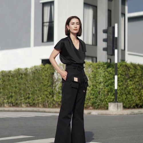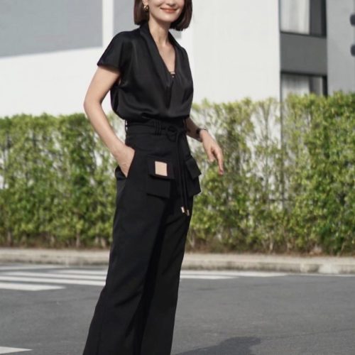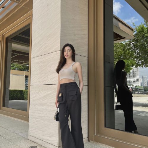 กางเกงขายาว เอวสูง ดีเทลผูกเชือกที่เอว มีกระเป๋าด้านหน้า ซิปซ่อนสวมใส่ง่าย เพิ่มดีเทลที่เชือกผูกตุ้มทองหรูหรา