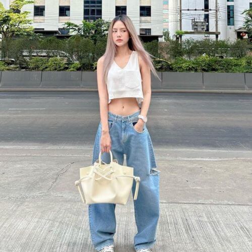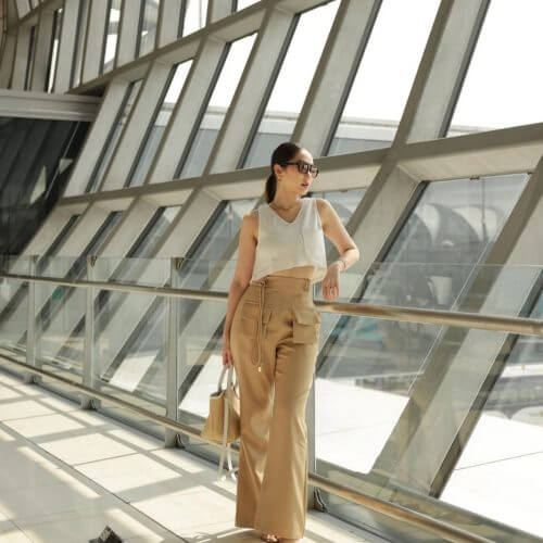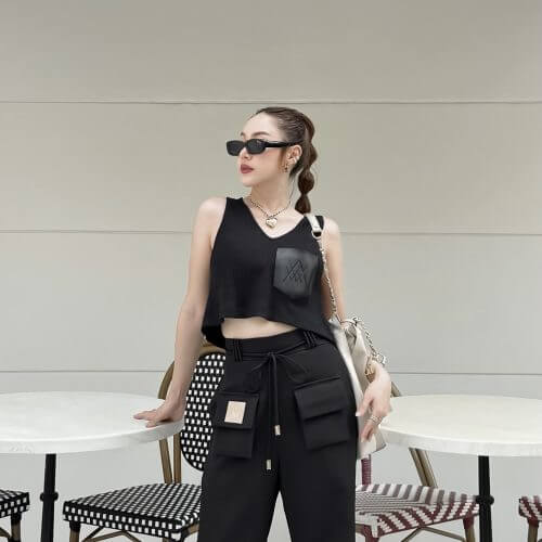 เสื้อครอปผ้าร่อง แต่งกระเป๋าหนังโลโก้แบรนด์ เรียบหรูดูพรีเมี่ยมเหมาะสำหรับวันใส่คล่องตัวและลุคสบายๆ
