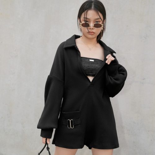 Description : Long-sleeved jumpsuit with a collar, rib knit, Extra details on pockets , High quality flexibility.