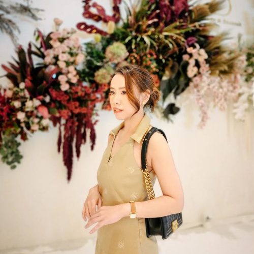 เดรสผ้าลินินยาว คอปก แขนกุด ซิปซ่อนด้านข้าง แต่งอะไหล่โลโก้แบรนด์สีทองด้านหน้า