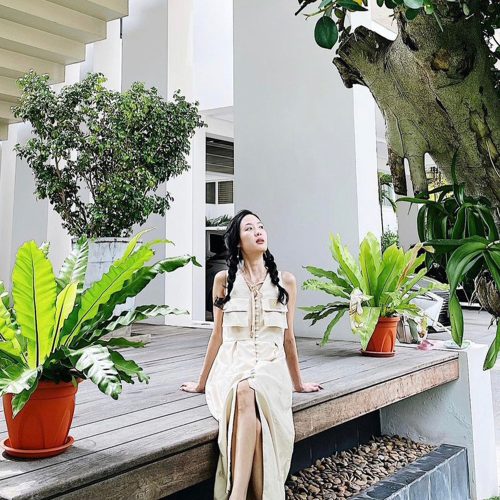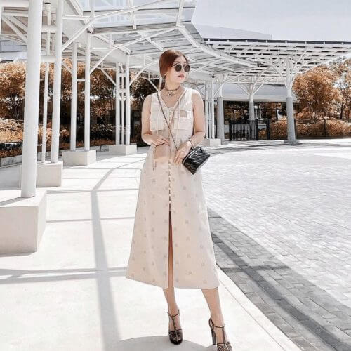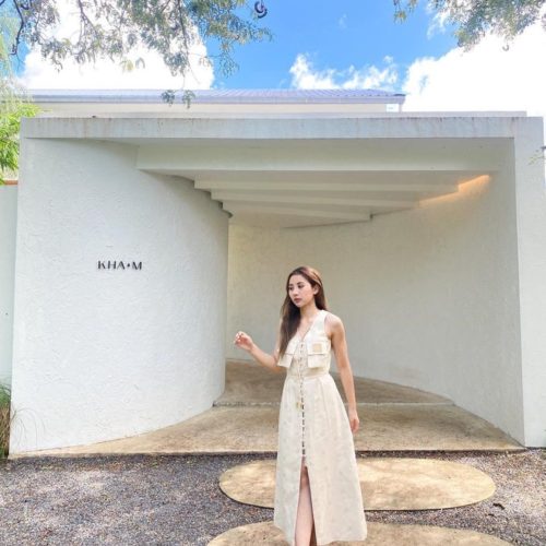 เดรสยาว ปักผ้าทั้งชุด มีซับใน กระดุมปั้มผ้าเดียวกัน เปิดกระดุมได้ทั้งตัว ใส่ง่ายมีซิปหลัง เพิ่มดีเทลที่เชือกผูกตุ้มทองหรูหรา