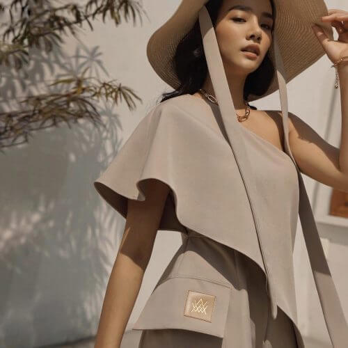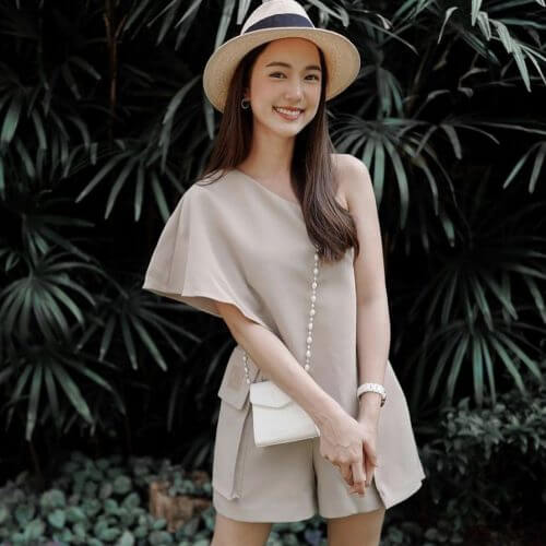 จั๊มสูทดีเทลเฉียง ทรงขาสั้นบาน กระเป๋าข้างใหญ่โดดเด่น ใส่ง่ายมีซิปข้างลำตัว