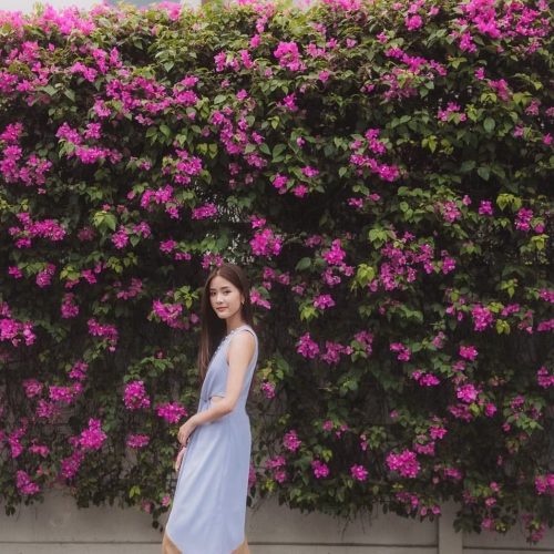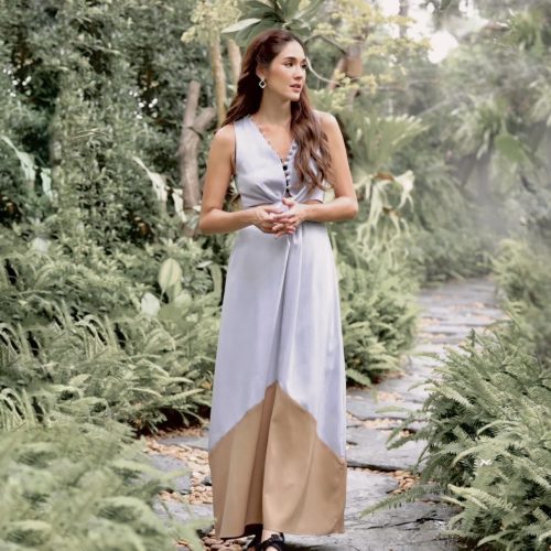 เดรสยาวทรงปล่อย แขนกุด สีทูโทน แต่งกระดุมเปิดปิดด้านหน้า ใช้งานได้จริง ตัดผ่าเดรสช่วงเอว