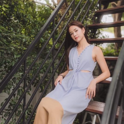 Description : Long dress, sleeveless. Two-tone color with button detailing on the front, cut-out dress at the waist.