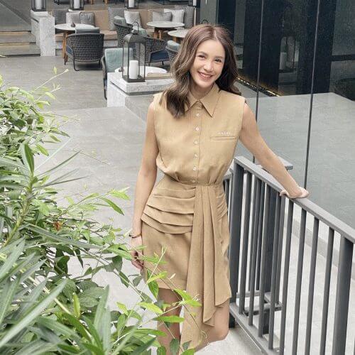 เดรสสั้นแขนกุดเหนือเข่า เสริมไหล่ทำให้ดูชิคขึ้น ปักโลโก้แบรนด์เหนือกระเป๋า แต่งด้วยกระดุมแบรนด์
