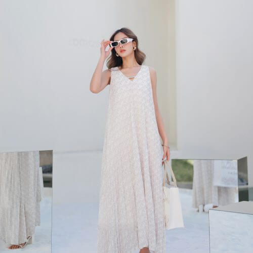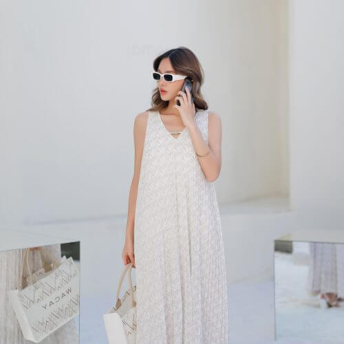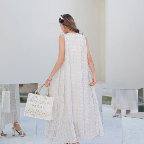 เดรสยาวอัดพลีทตัว ผ้าพริ้ว ยับยาก มีซับใน พิมพ์เอกลักษณ์ลวดลายโมโนแกรมทั้งตัว