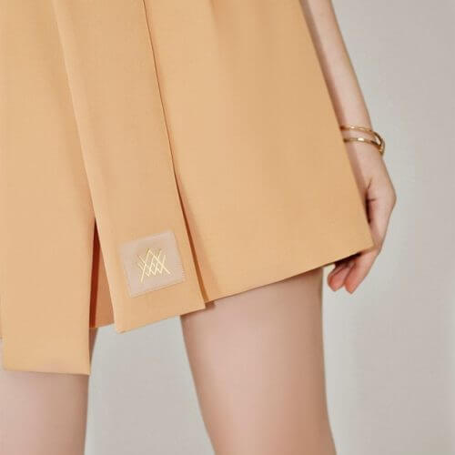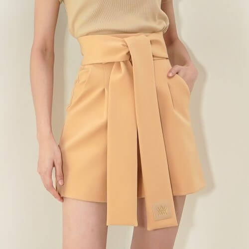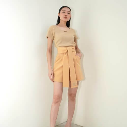 Description : High-waist and wide-leg shorts with tied belt in the same fabric. Side pockets and front zip.